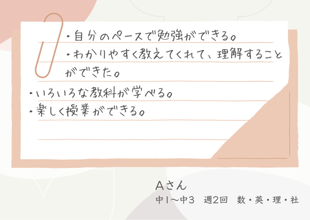中学校の勉強の難しさや量の多さに戸惑っていたKさん。しかし、自分の成長を疑わないポジティブさで、どんどん力をつけていきました。「今日はこれがやりたい」と目的をもって塾に通うようになり、家庭学習からも力をつけることができるようになりました。